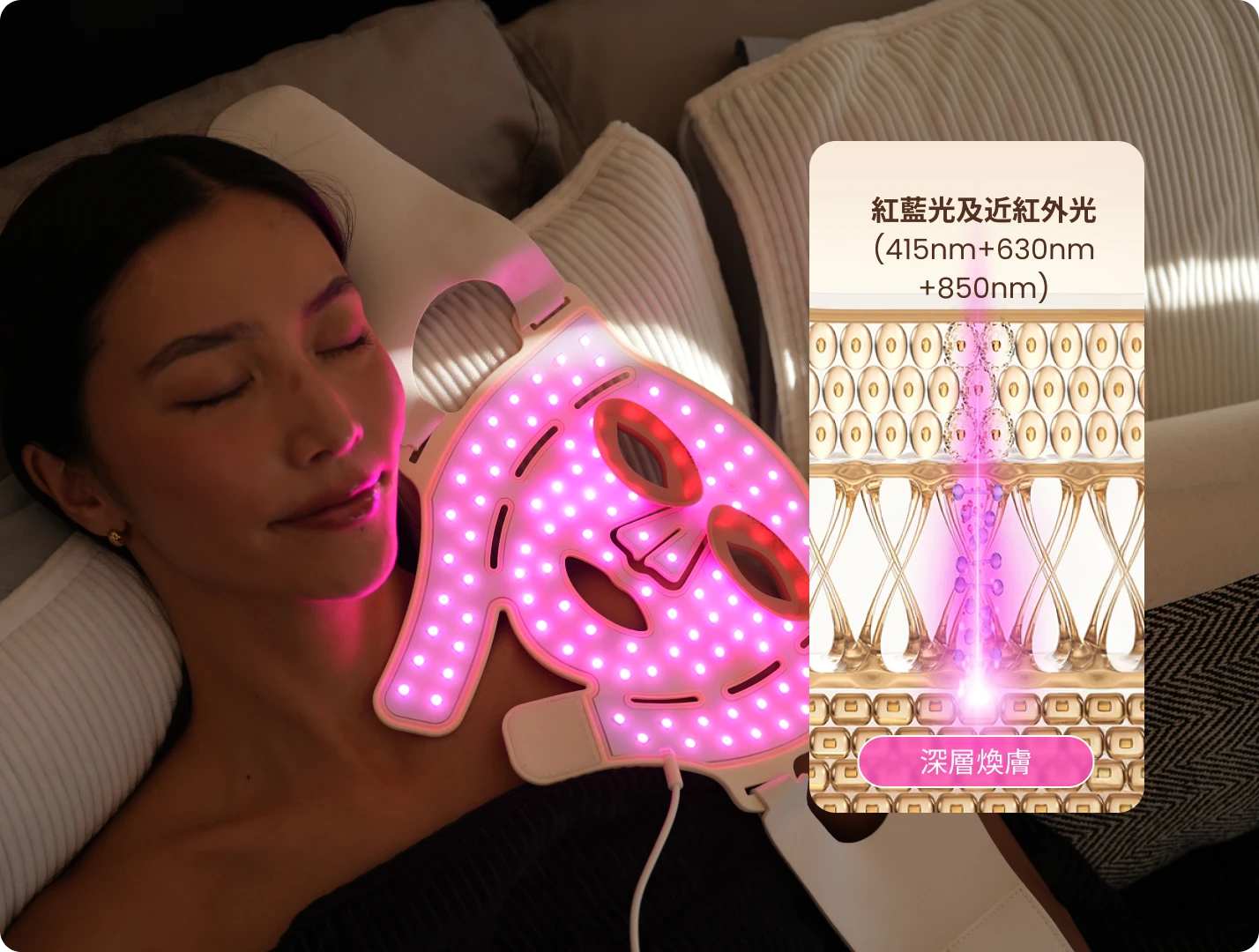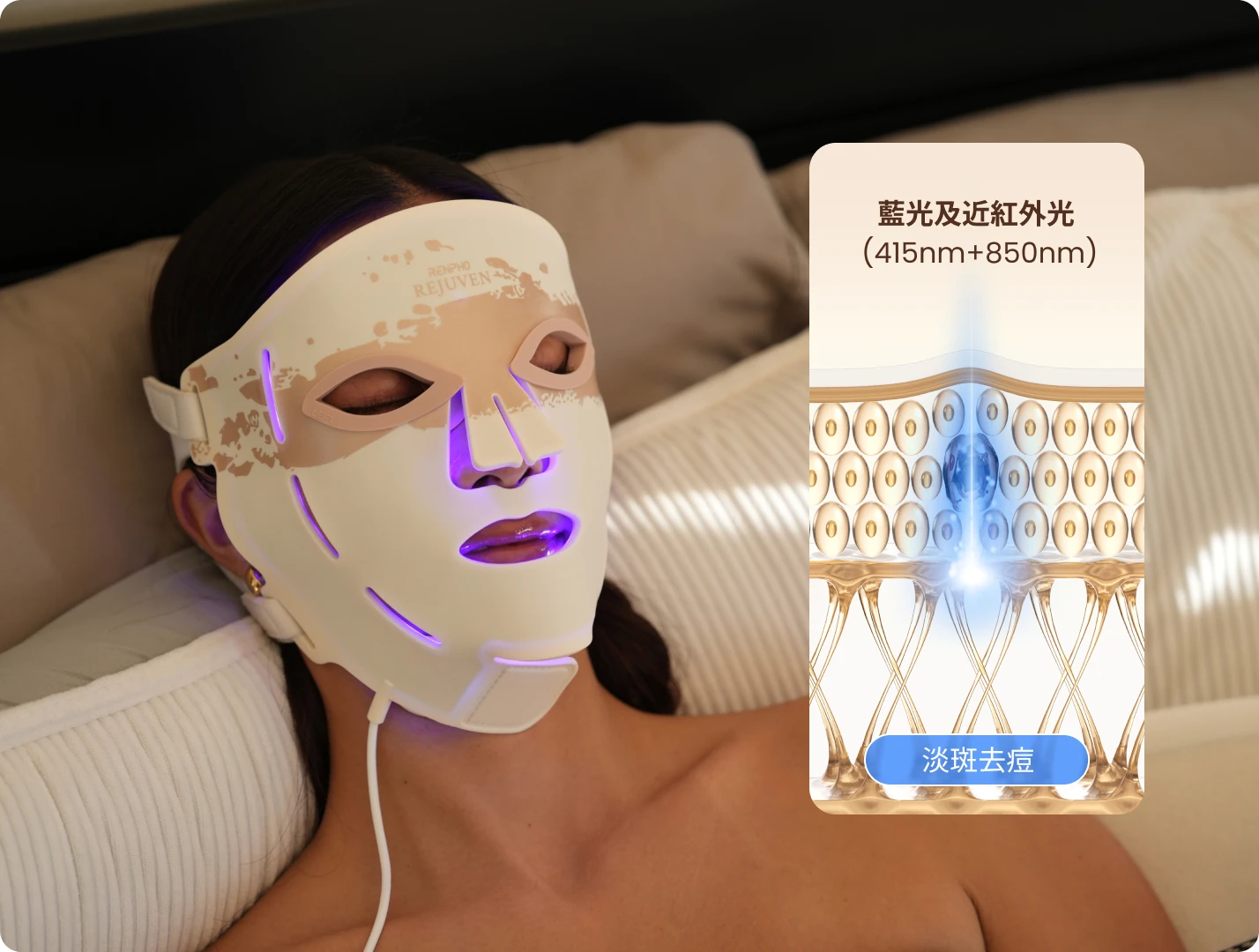 - • 3種光療模式:紅光、藍光及近紅外光
